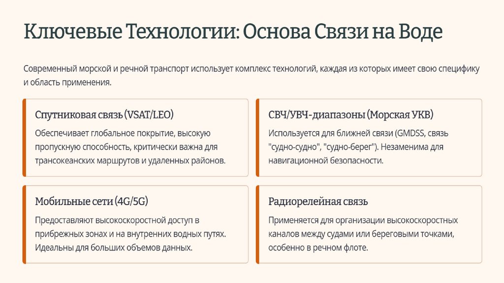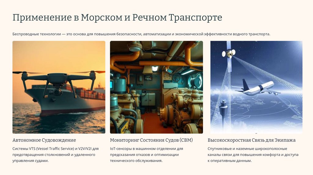 Применение в Морском и Речном ТранспортеБеспроводные технологии — это основа для повышения безопасности, автоматизации и экономической эффективности водного транспорта.