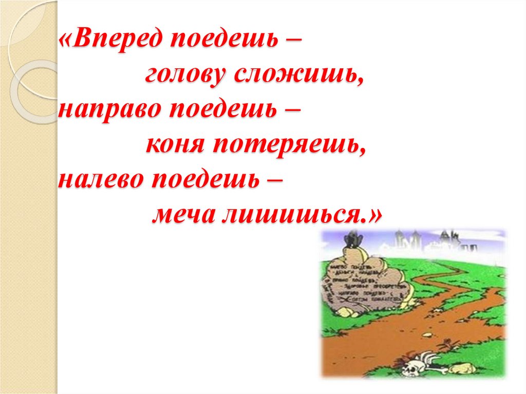 1. «Вперед поедешь – голову сложишь, направо поедешь – коня потеряешь, налево поедешь – меча лишишься.»