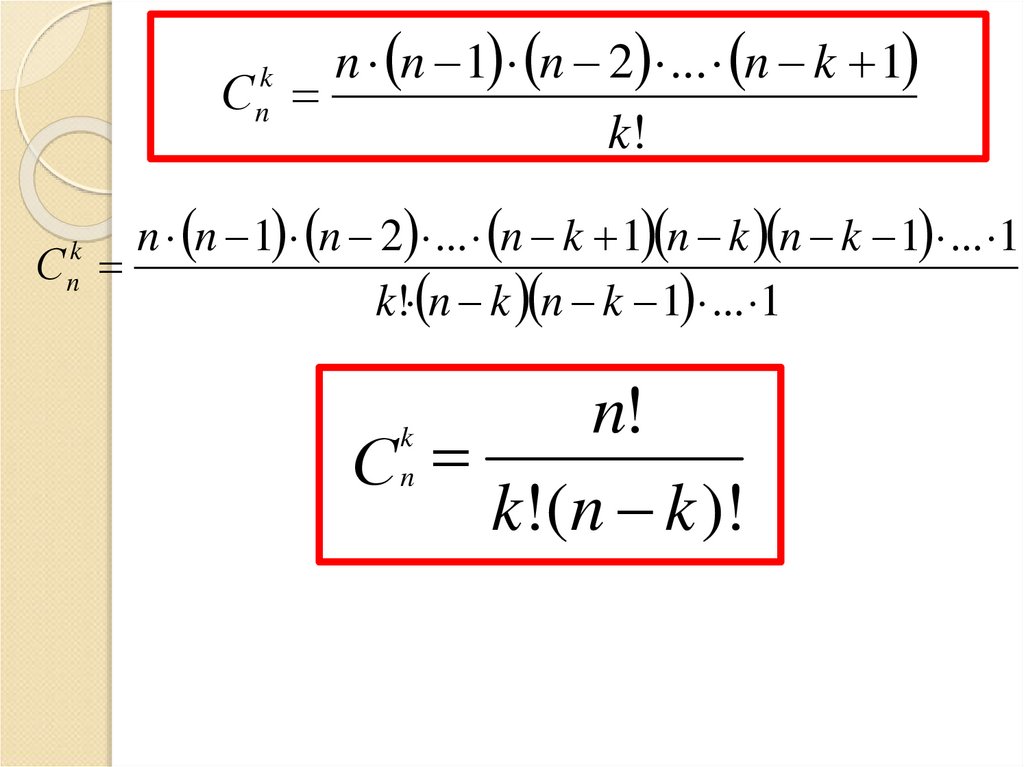 18. Сочетанием из n элементов по k (k ≤ n) называется любое множество, состоящее из k элементов, взятых из данных n элементов.