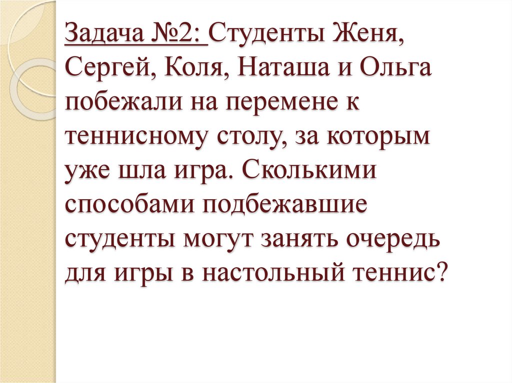 Задача №2: Студенты Женя,Сергей, Коля, Наташа и Ольга