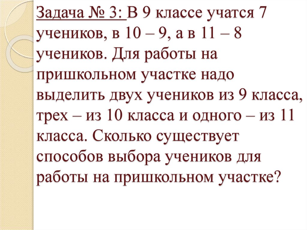 Задача № 3: В 9 классе учатся 7учеников, в 10 – 9, а в 11 – 8