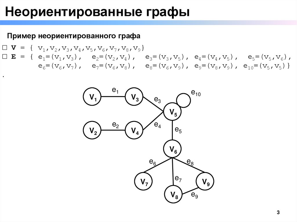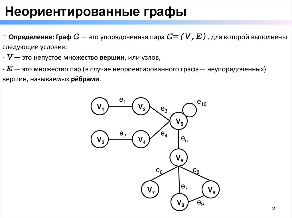- E — это множество пар (в случае неориентированного графа— неупорядоченных)