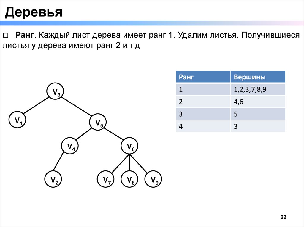 Деревья□ Ранг. Каждый лист дерева имеет ранг 1. Удалим листья. Получившиеся