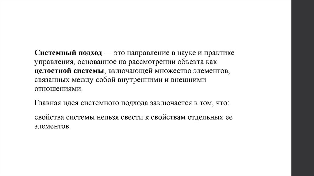 Системный подход — это направление в науке и практикеуправления, основанное на рассмотрении объекта как