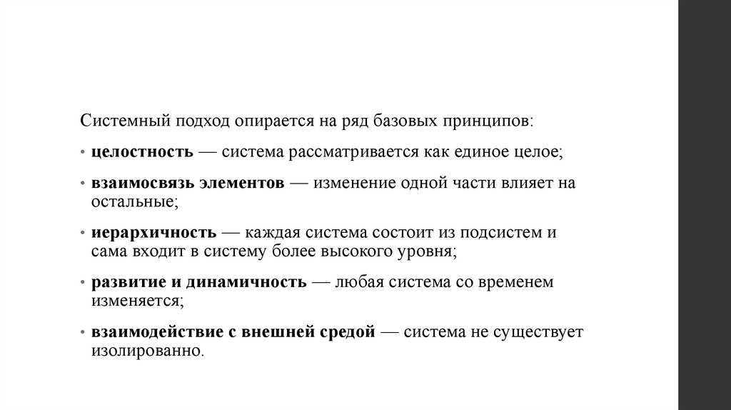 Системный подход опирается на ряд базовых принципов:• целостность — система рассматривается как единое целое;