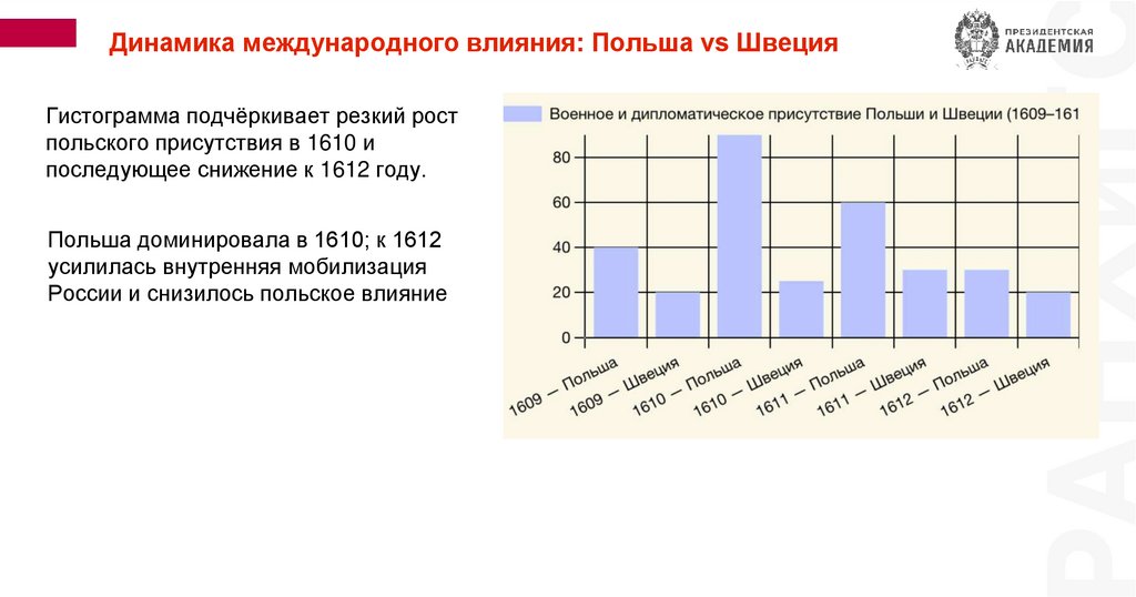 Динамика международного влияния: Польша vs ШвецияГистограмма подчёркивает резкий рост