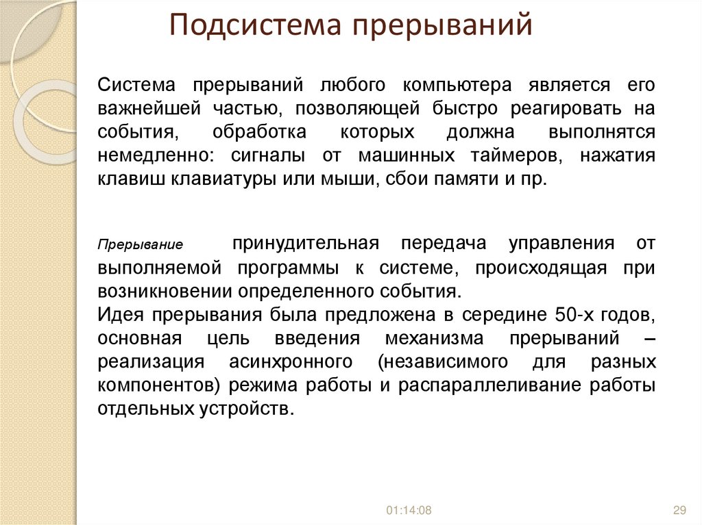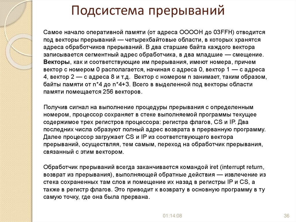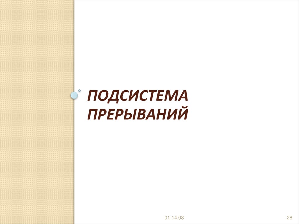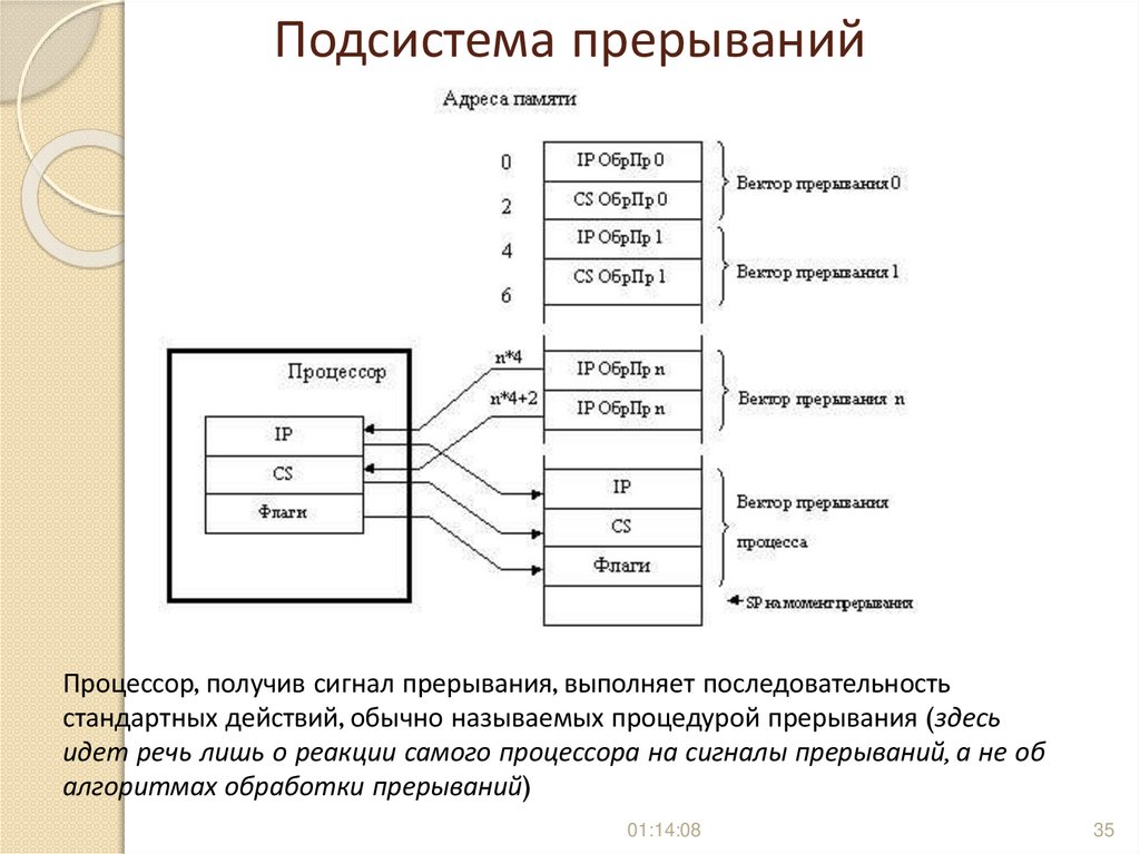 Подсистема прерыванийПроцессор, получив сигнал прерывания, выполняет последовательность