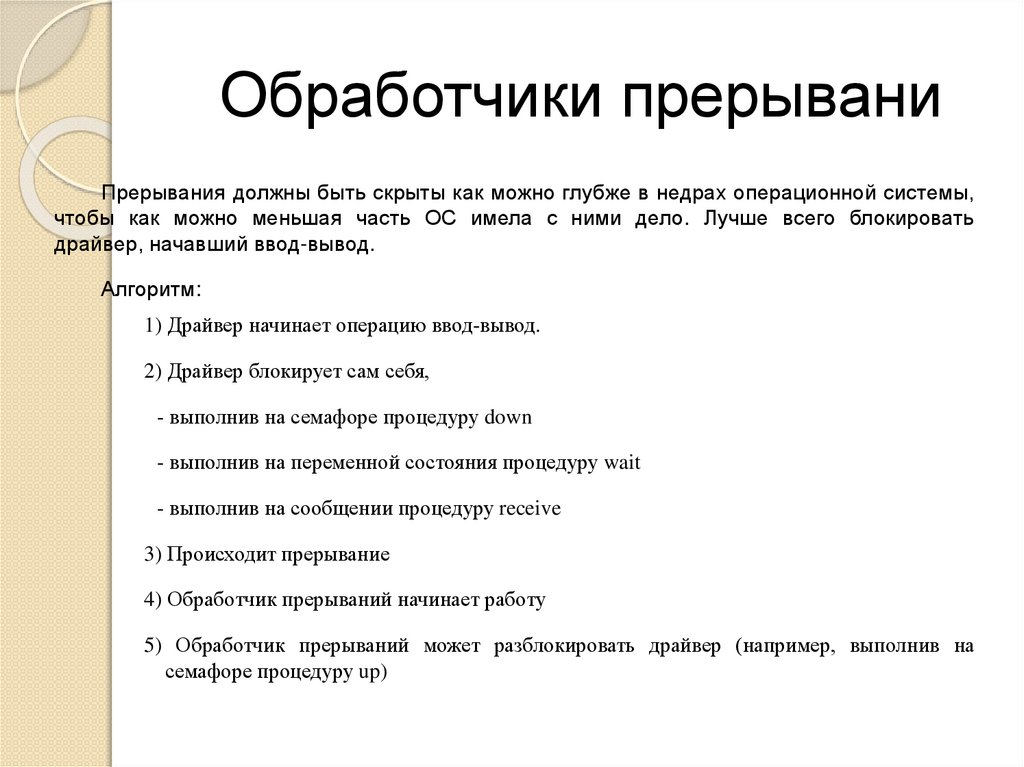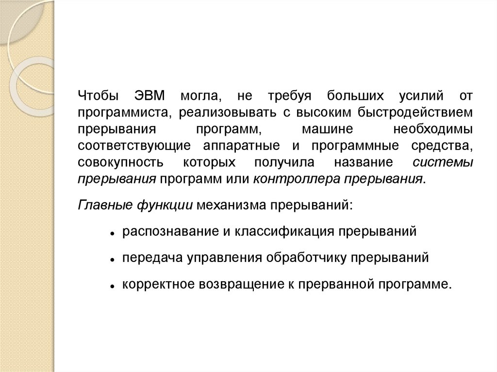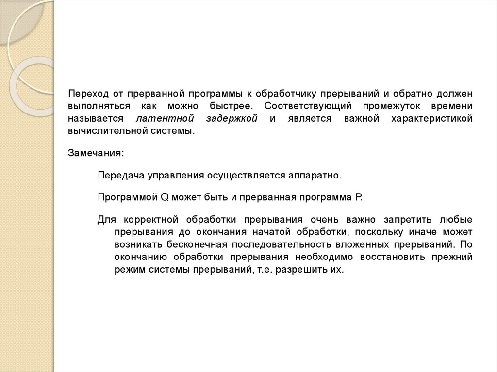 Переход от прерванной программы к обработчику прерываний и обратно долженвыполняться как можно быстрее. Соответствующий промежуток времени
