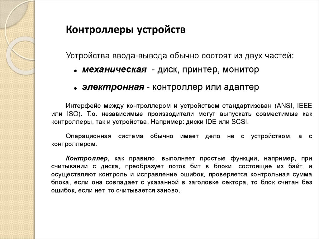 Контроллеры устройствУстройства ввода-вывода обычно состоят из двух частей: