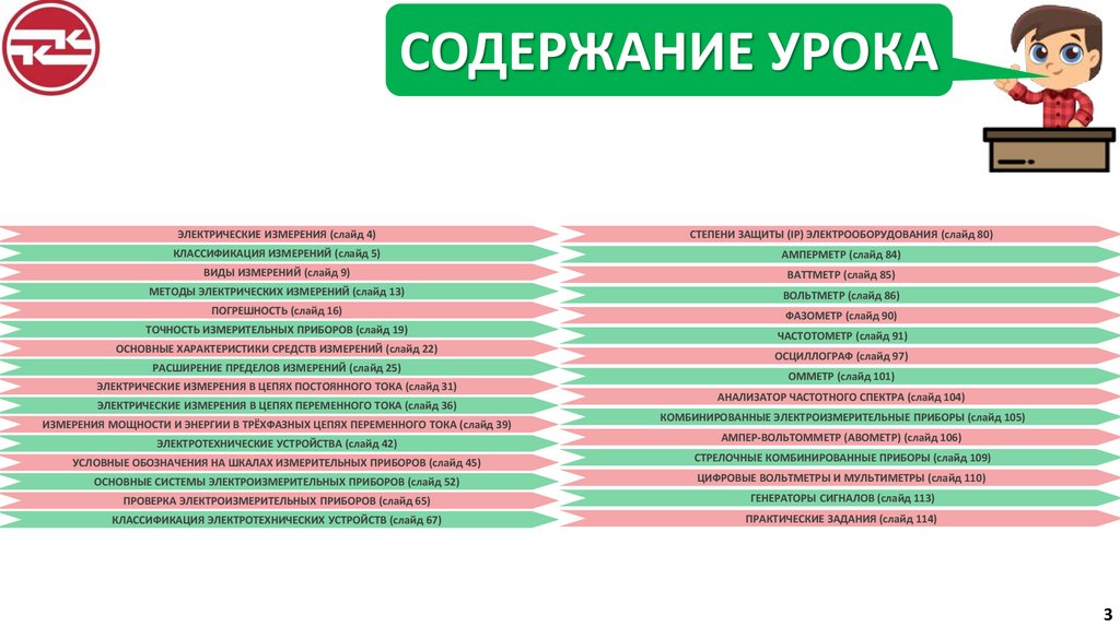 СОДЕРЖАНИЕ УРОКАЭЛЕКТРИЧЕСКИЕ ИЗМЕРЕНИЯ (слайд 4)