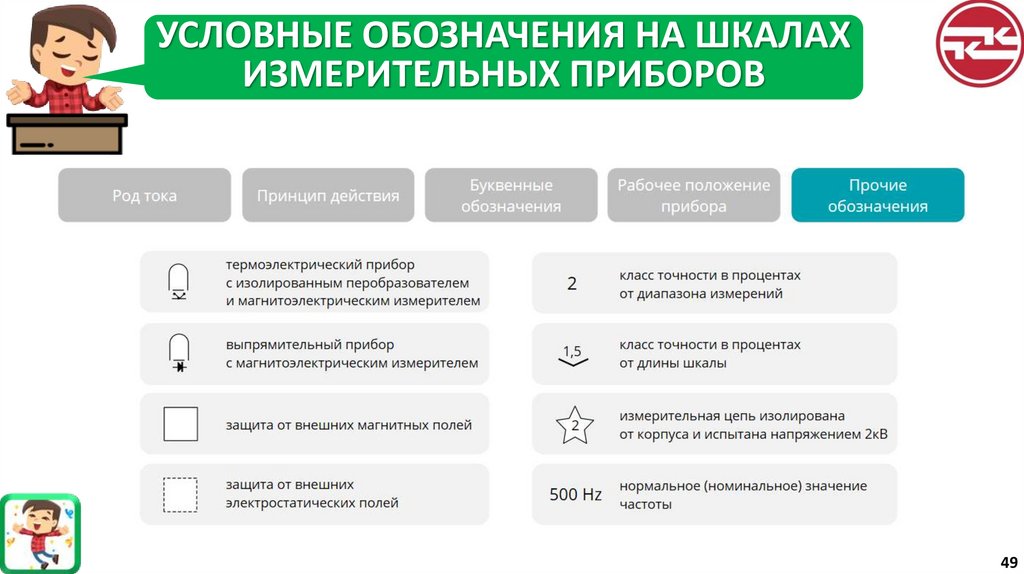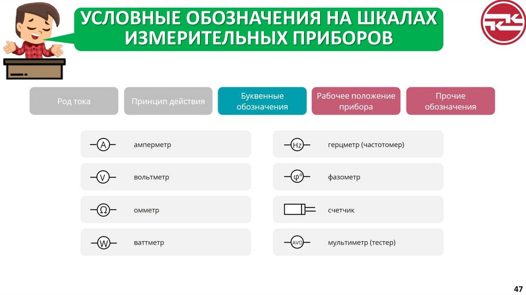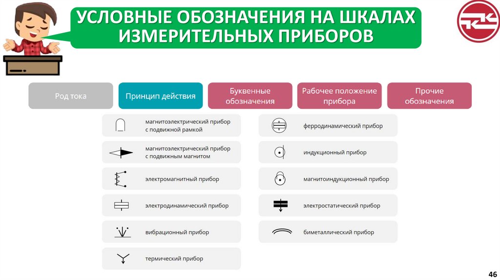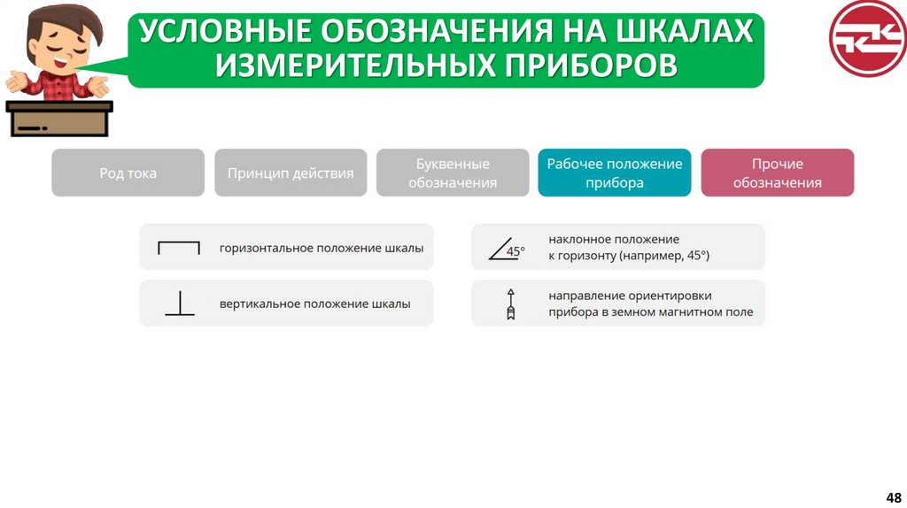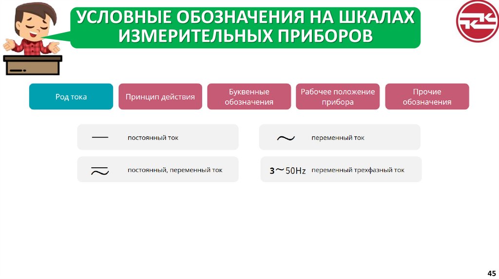 УСЛОВНЫЕ ОБОЗНАЧЕНИЯ НА ШКАЛАХ ИЗМЕРИТЕЛЬНЫХ ПРИБОРОВ (слайд 45)