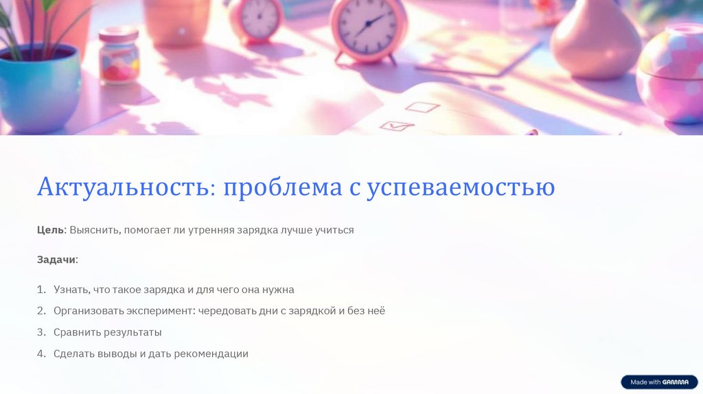 Актуальность: проблема с успеваемостьюЦель: Выяснить, помогает ли утренняя зарядка лучше учиться