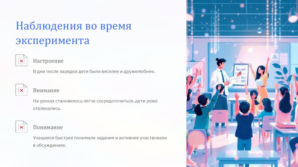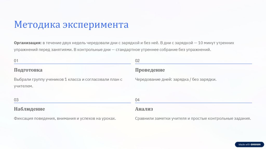 Методика экспериментаОрганизация: в течение двух недель чередовали дни с зарядкой и без неё. В дни с зарядкой — 10 минут утренних