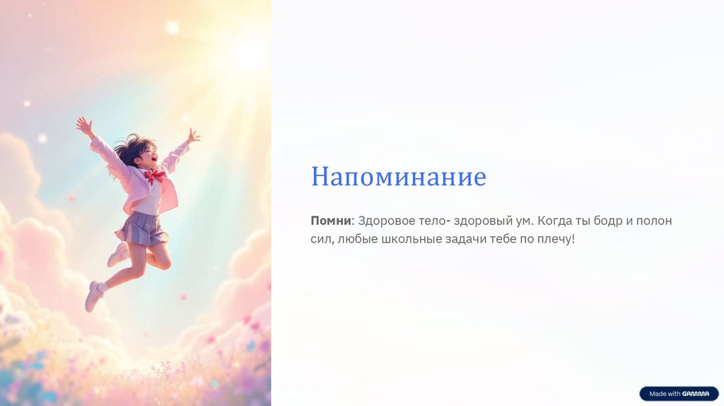НапоминаниеПомни: Здоровое тело- здоровый ум. Когда ты бодр и полон