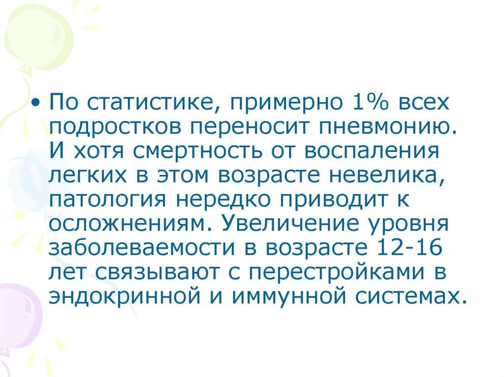 • По статистике, примерно 1% всехподростков переносит пневмонию.