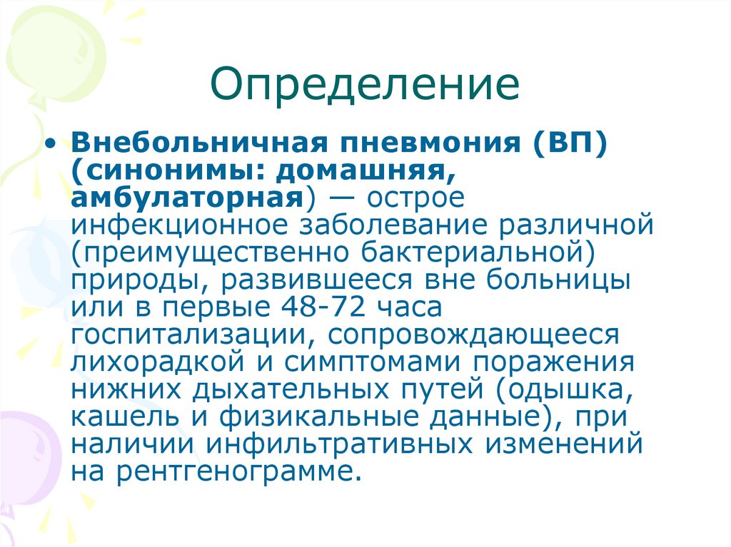 Определение• Внебольничная пневмония (ВП)