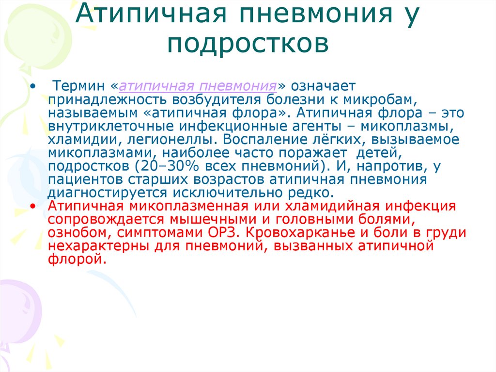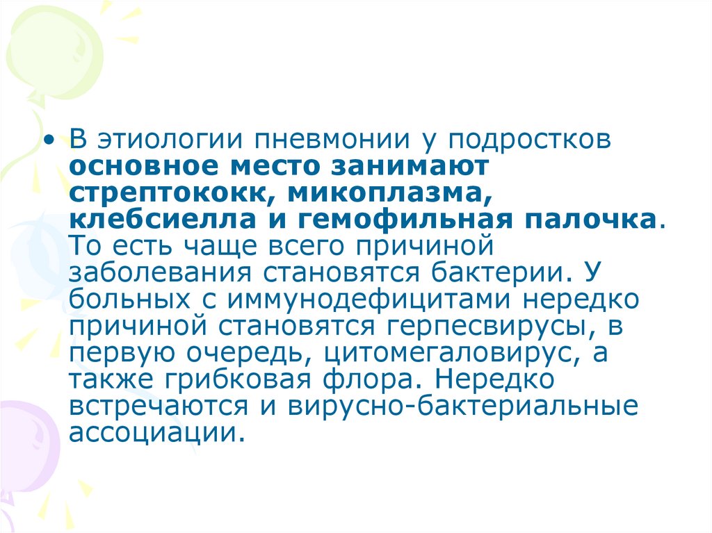 • В этиологии пневмонии у подростковосновное место занимают
