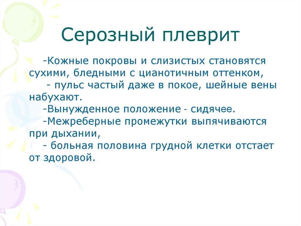 • Гнойный плеврит протекает наиболее тяжело,