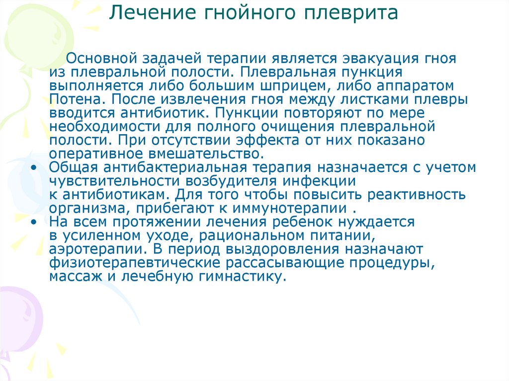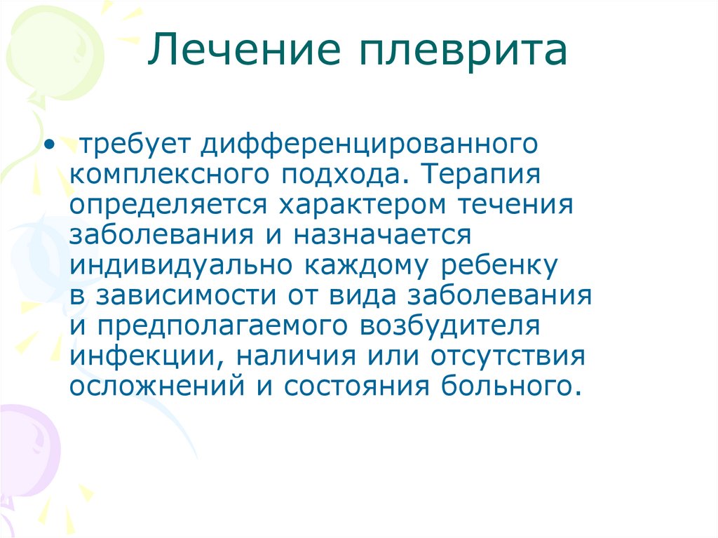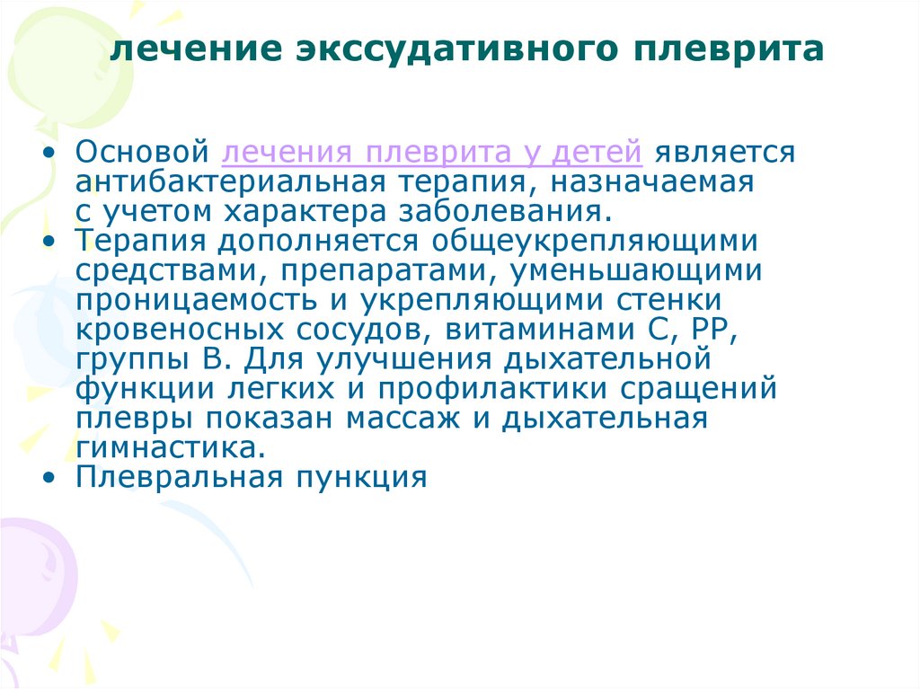 лечение экссудативного плеврита• Основой лечения плеврита у детей является
