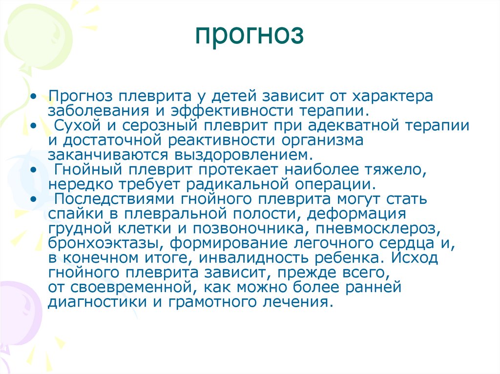 прогноз• Прогноз плеврита у детей зависит от характера