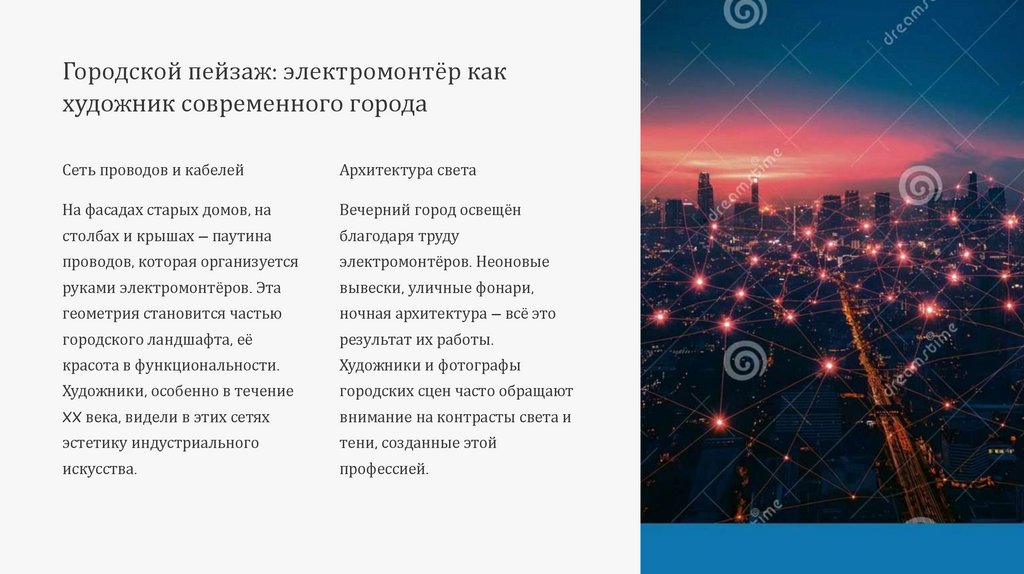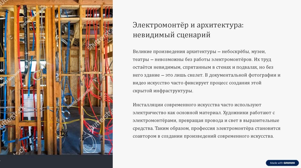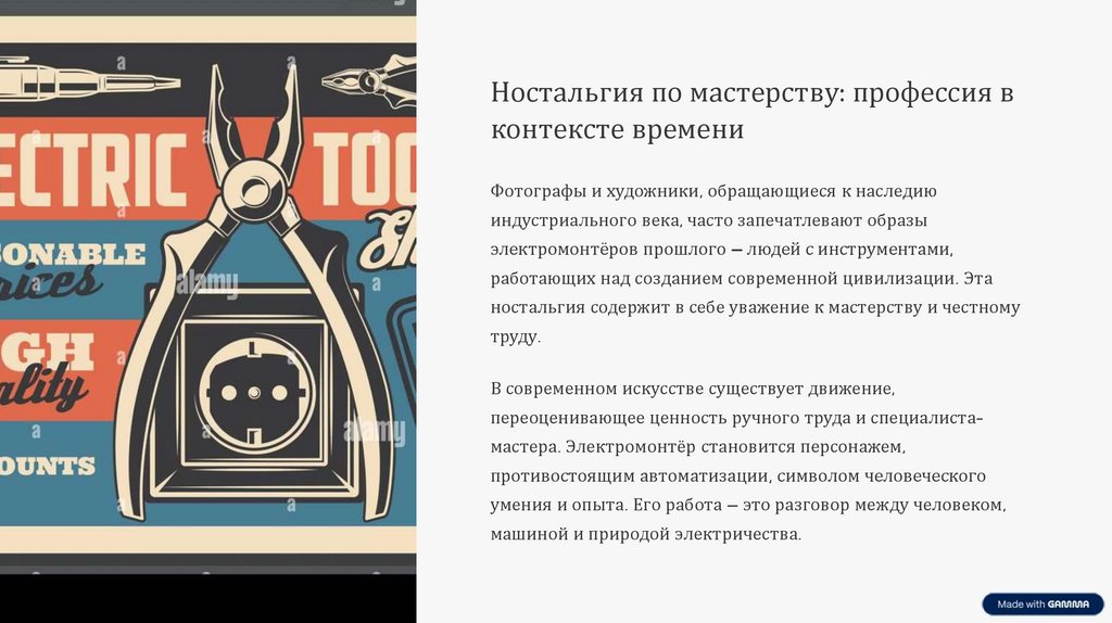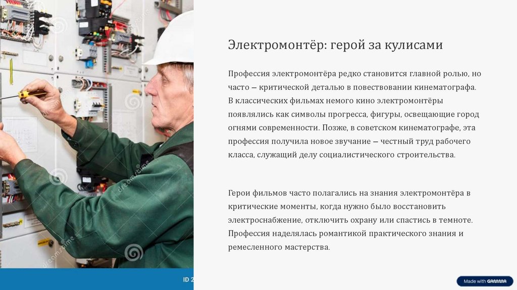 переоценивающее ценность ручного труда и специалистамастера. Электромонтёр становится персонажем,