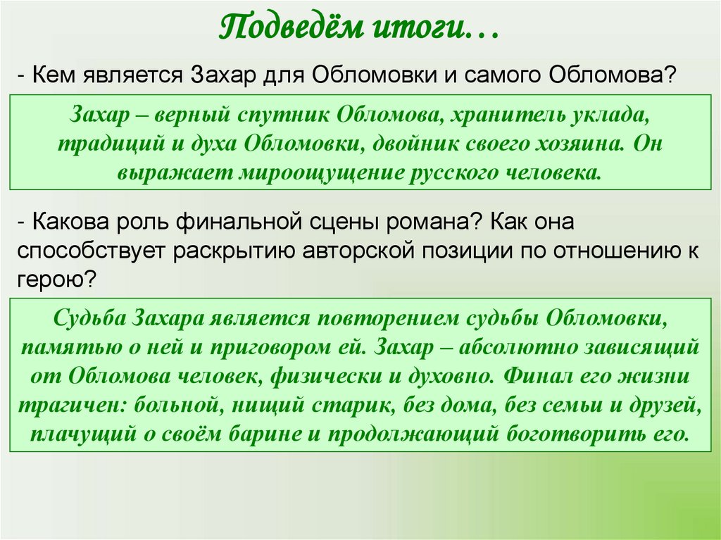 Подведём итоги…- Кем является Захар для Обломовки и самого Обломова?