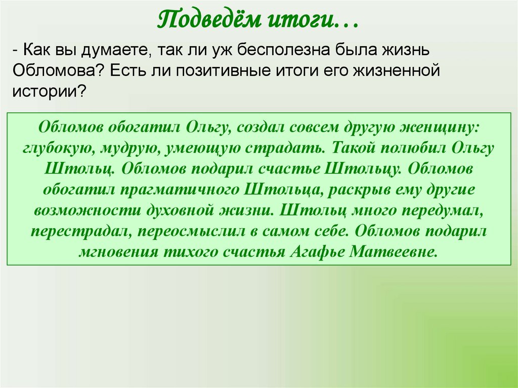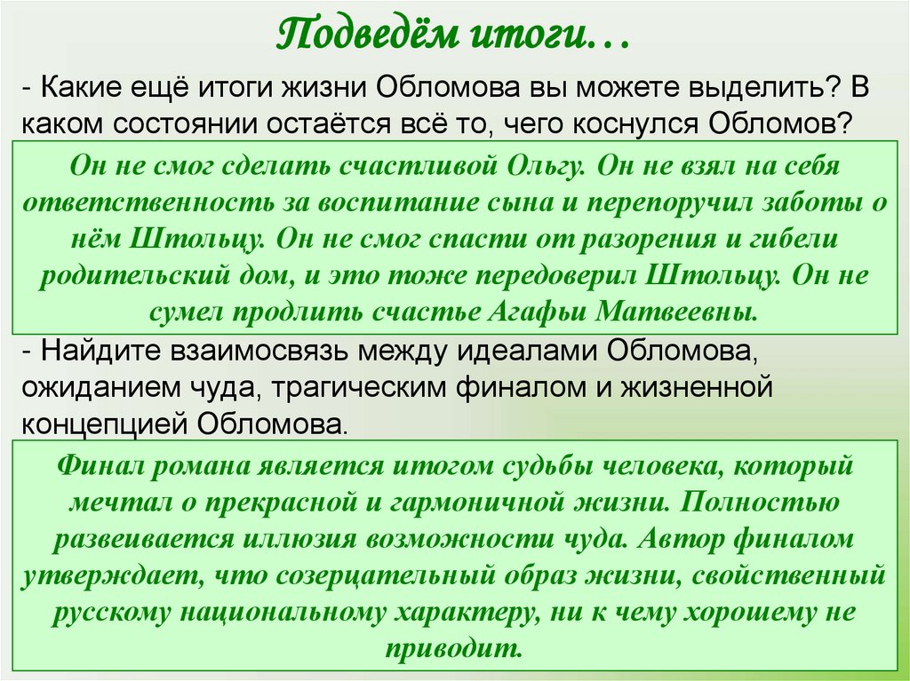 Подведём итоги…- Какие ещё итоги жизни Обломова вы можете выделить? В