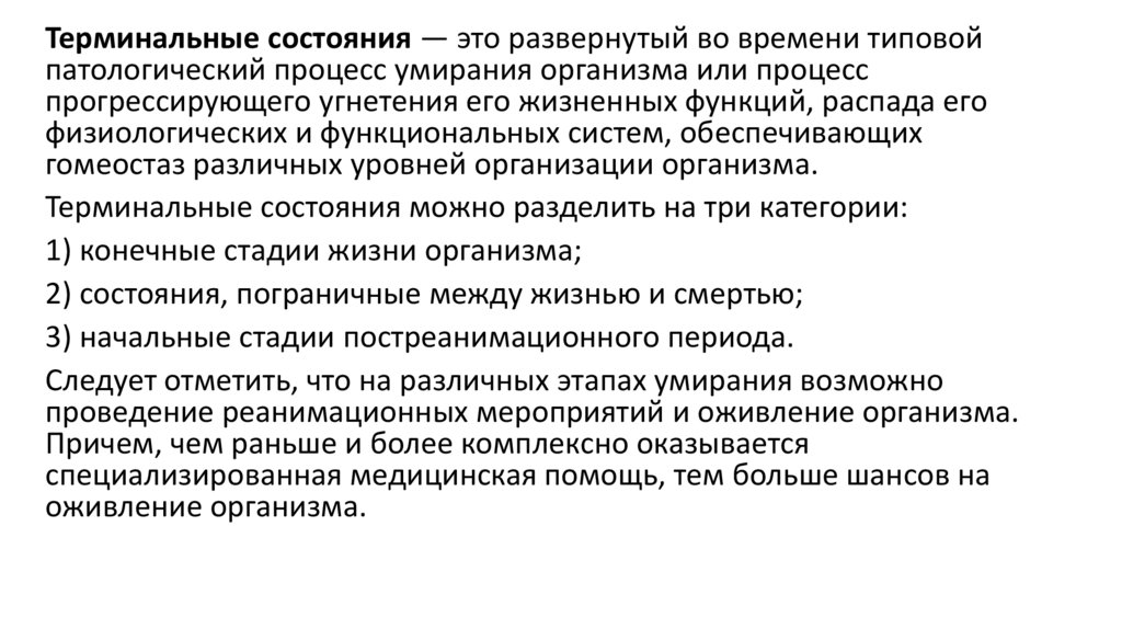 Терминальные состояния — это развернутый во времени типовойпатологический процесс умирания организма или процесс