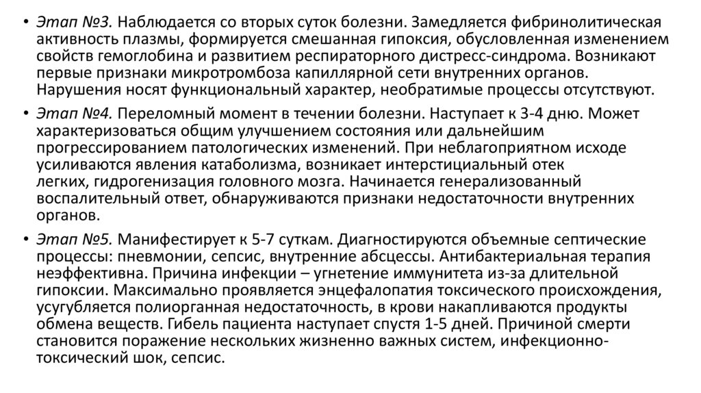 • Этап №5. Манифестирует к 5-7 суткам. Диагностируются объемные септические