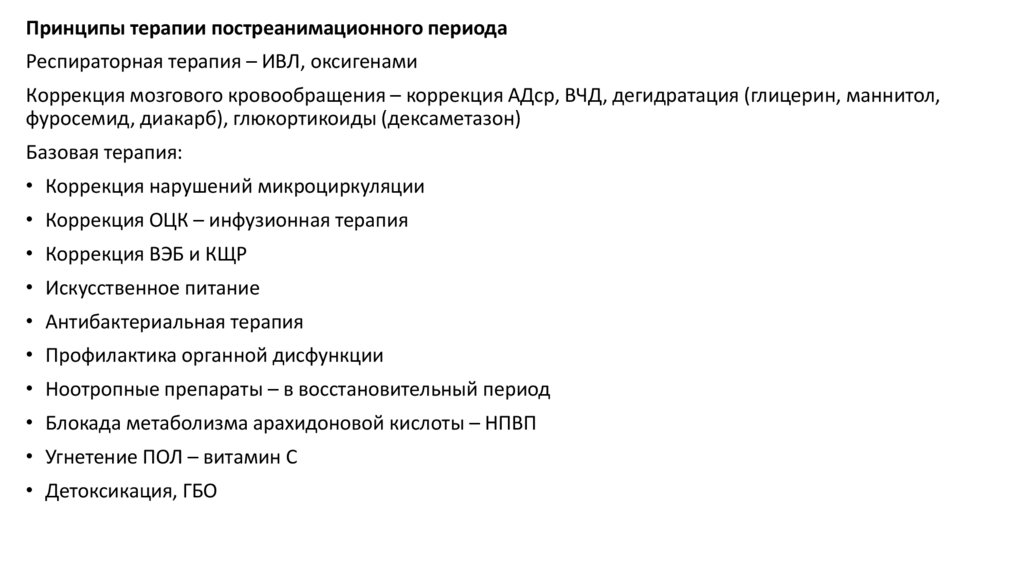 Коррекция мозгового кровообращения – коррекция АДср, ВЧД, дегидратация (глицерин, маннитол,