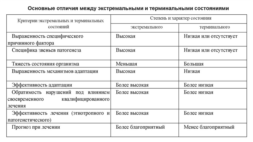 Основные отличия между экстремальными и терминальными состояниямиКритерии экстремальных и терминальных