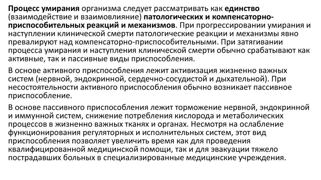 Процесс умирания организма следует рассматривать как единство(взаимодействие и взаимовлияние) патологических и компенсаторноприспособительных реакций и механизмов. При прогрессировании умирания и