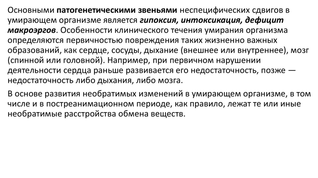 Основными патогенетическими звеньями неспецифических сдвигов вумирающем организме является гипоксия, интоксикация, дефицит