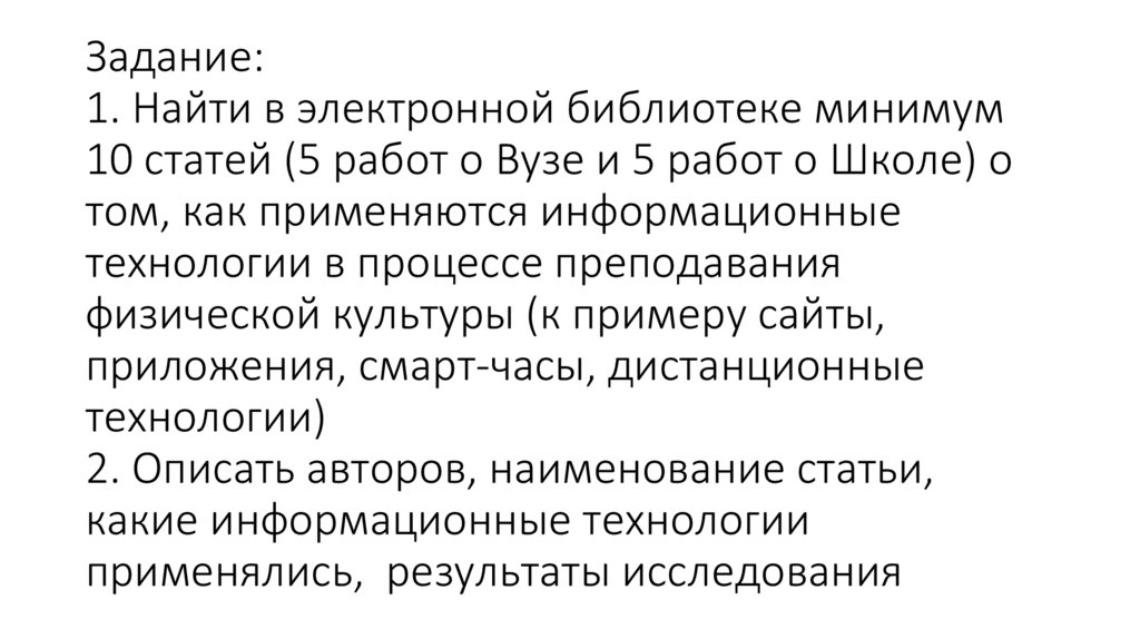 1. Задание: 1. Найти в электронной библиотеке минимум 10 статей (5 работ о Вузе и 5 работ о Школе) о том, как применяются