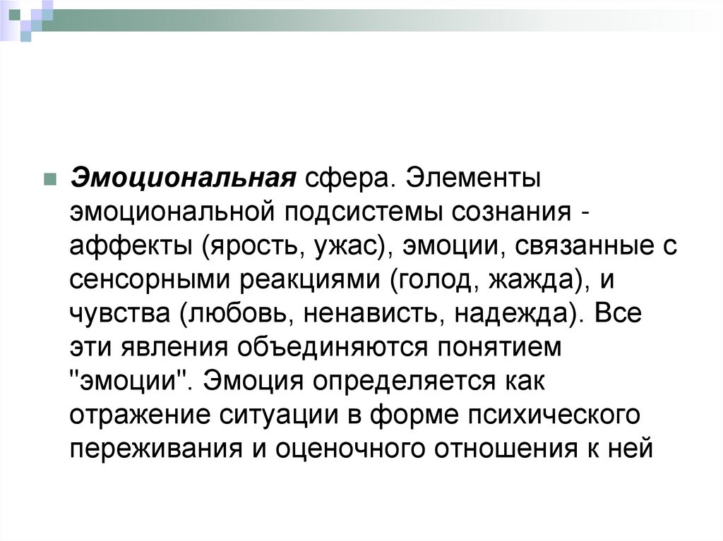 Эмоциональная сфера. Элементыэмоциональной подсистемы сознания аффекты (ярость, ужас), эмоции, связанные с