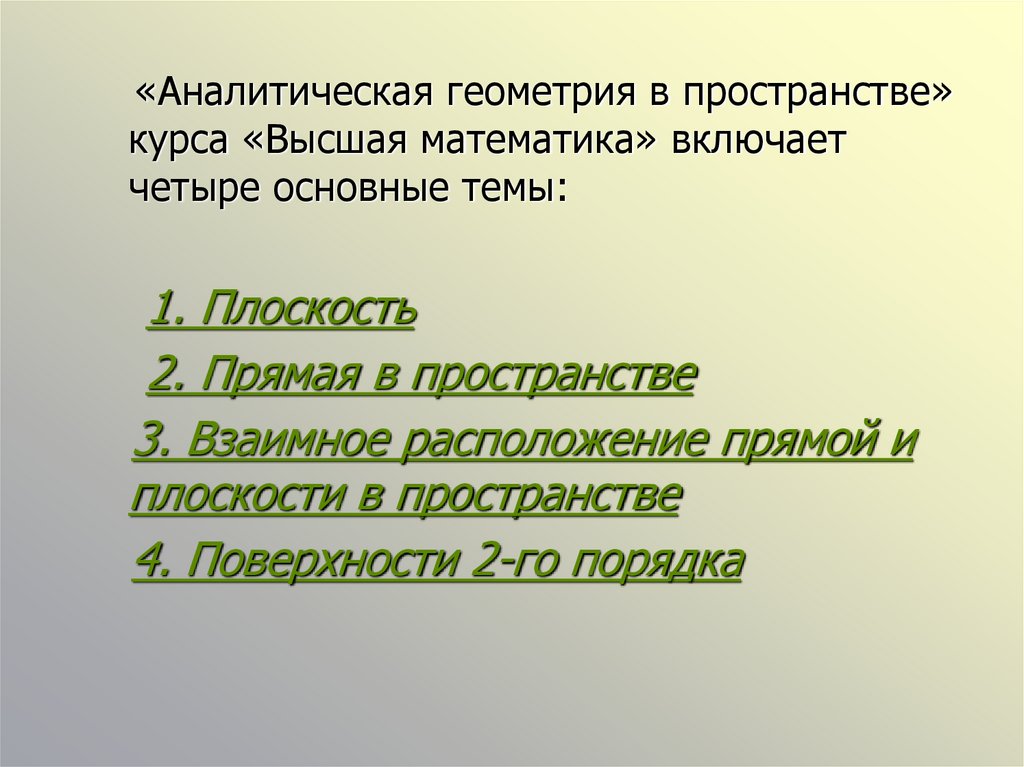 «Аналитическая геометрия в пространстве»курса «Высшая математика» включает