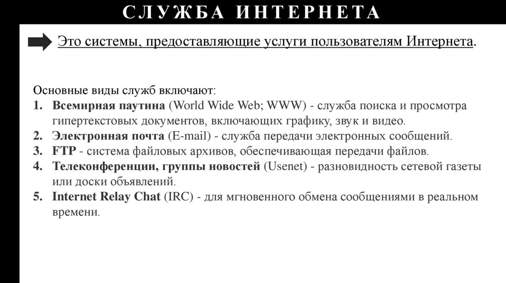 СЛ У Ж Б А И Н Т Е Р Н Е ТАЭто системы, предоставляющие услуги пользователям Интернета.