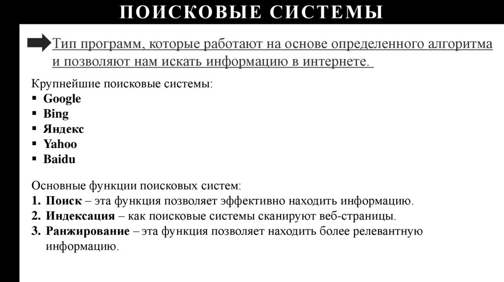 ПОИСКОВЫЕ СИСТЕМЫТип программ, которые работают на основе определенного алгоритма