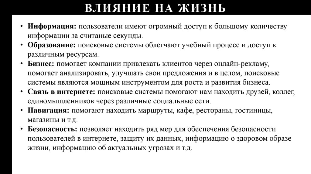 ВЛИЯНИЕ НА ЖИЗНЬ• Информация: пользователи имеют огромный доступ к большому количеству