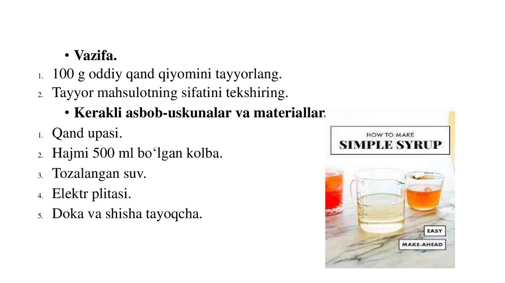 • Vazifa.1. 100 g oddiy qand qiyomini tayyorlang.