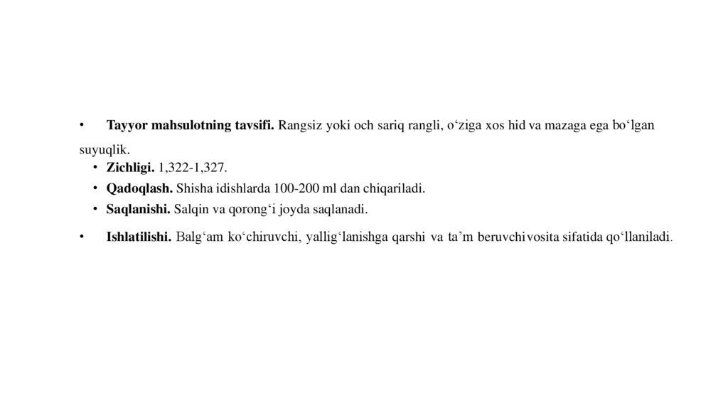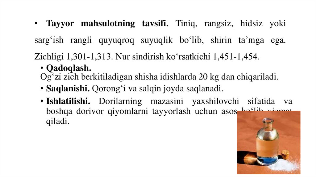 • Tayyor mahsulotning tavsifi. Rangsiz, tiniq yoki sal tovlanuvchi xush taʼm