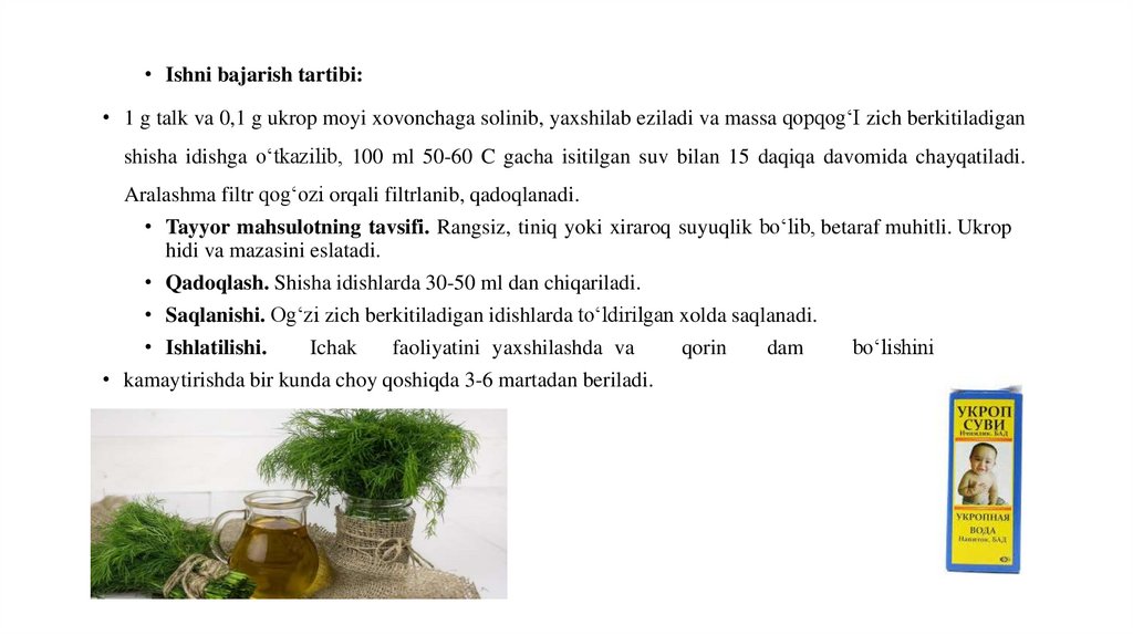 • Tarkibi.• Ukrop moyi — 1 gTalk — 10 g