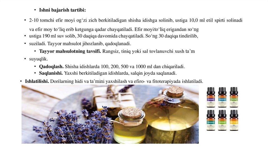 • Ishni bajarish tartibi:• 2-10 tomchi efir moyi ogʻzi zich berkitiladigan shisha idishga solinib, ustiga 10,0 ml etil spirti solinadi