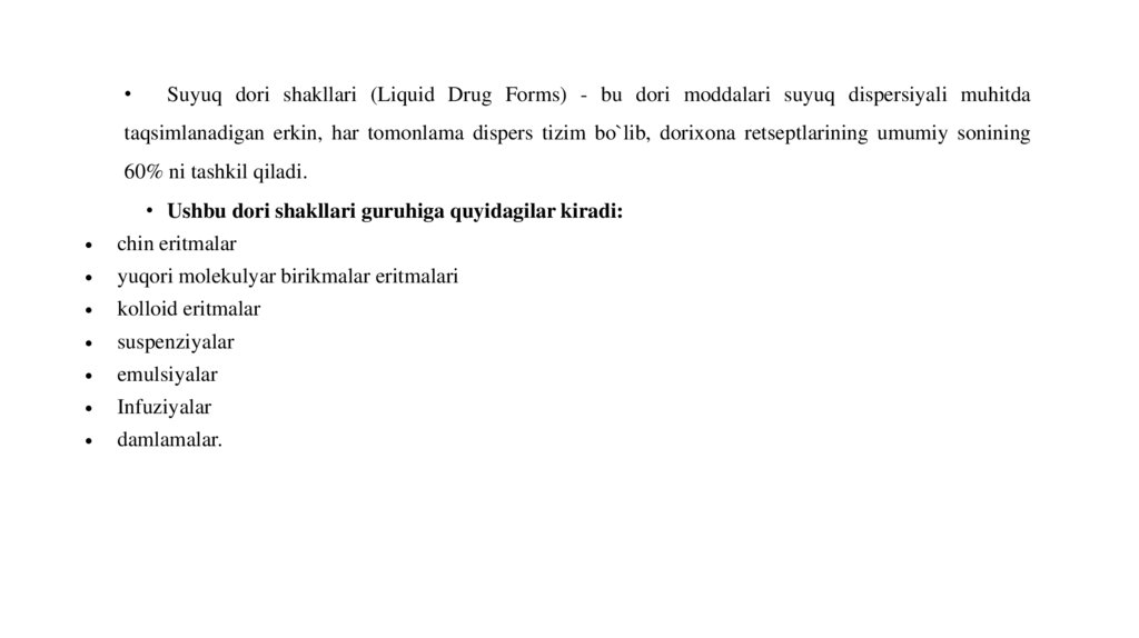 Suyuq dori shakllari (Liquid Drug Forms) - bu dori moddalari suyuq dispersiyali muhitda