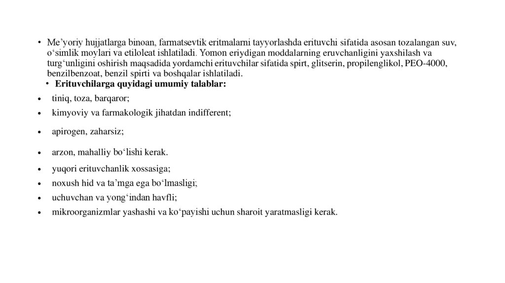 Shuningdek farmatsevtikamaliyotda ishlatiladigan erituvchilar quyidagi asosiy hususiyatlarga ega boʻlishi lozim: