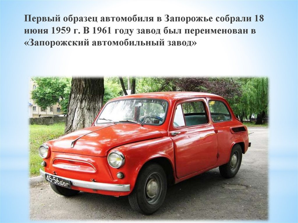 Первый образец автомобиля в Запорожье собрали 18июня 1959 г. В 1961 году завод был переименован в