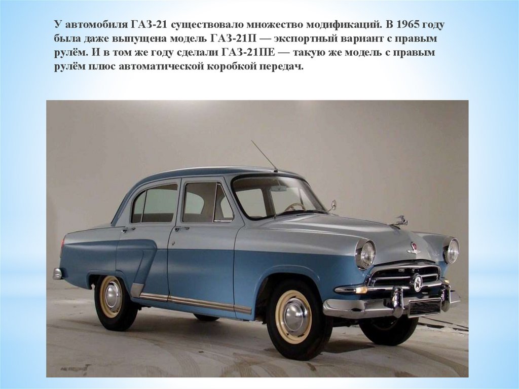 У автомобиля ГАЗ-21 существовало множество модификаций. В 1965 годубыла даже выпущена модель ГАЗ-21П — экспортный вариант с правым