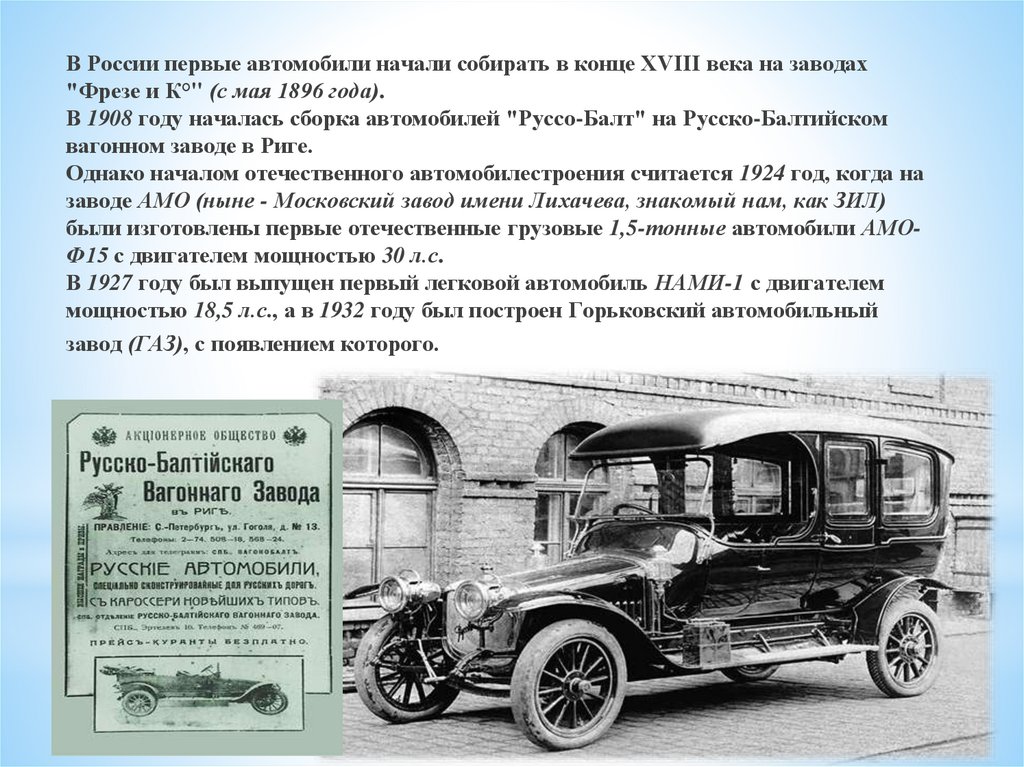 В России первые автомобили начали собирать в конце XVIII века на заводах"Фрезе и К°" (с мая 1896 года).