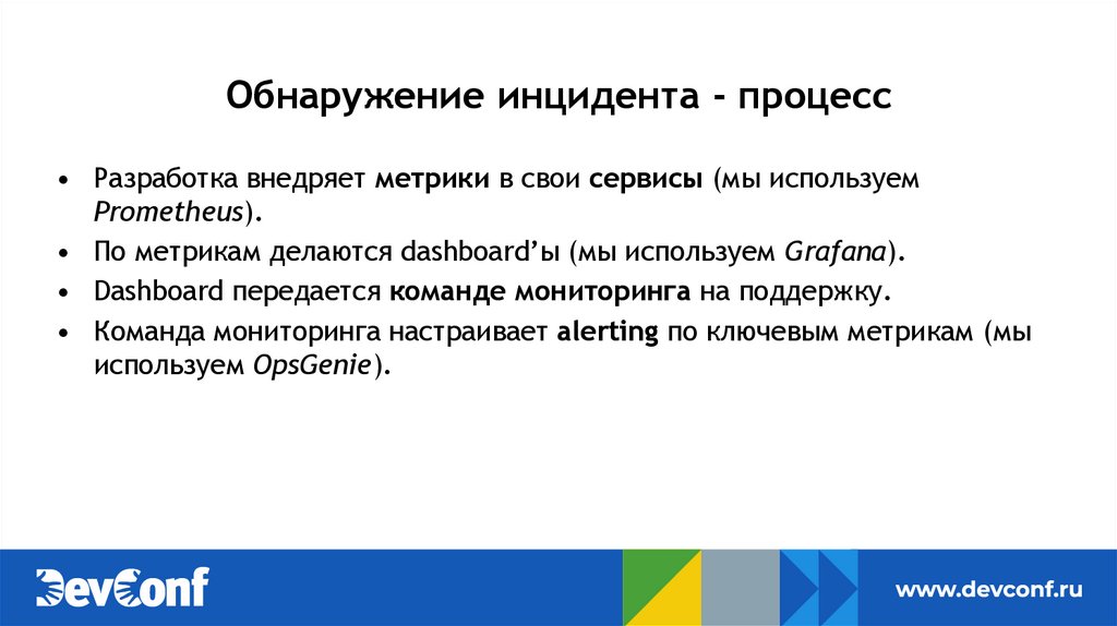 Обнаружение инцидента - процесс• Разработка внедряет метрики в свои сервисы (мы используем