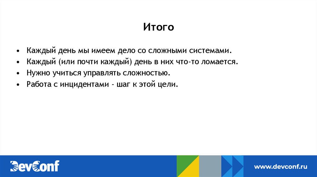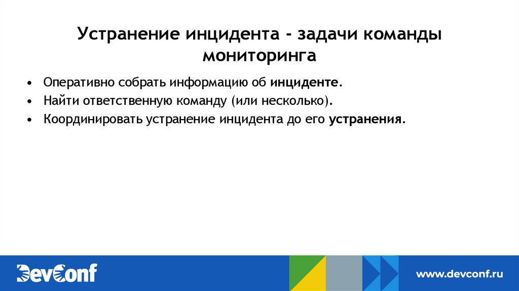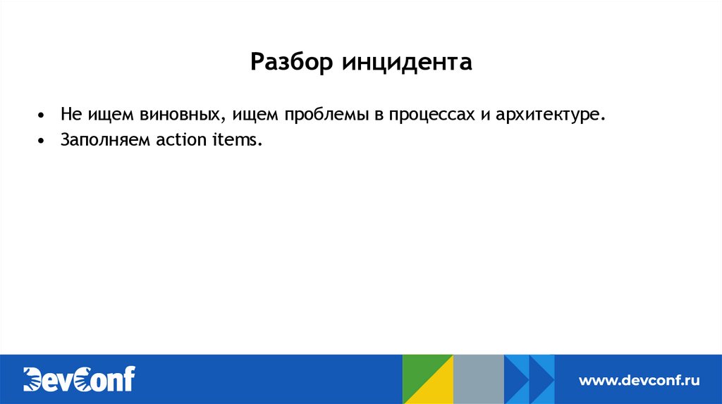Разбор инцидента• Не ищем виновных, ищем проблемы в процессах и архитектуре.